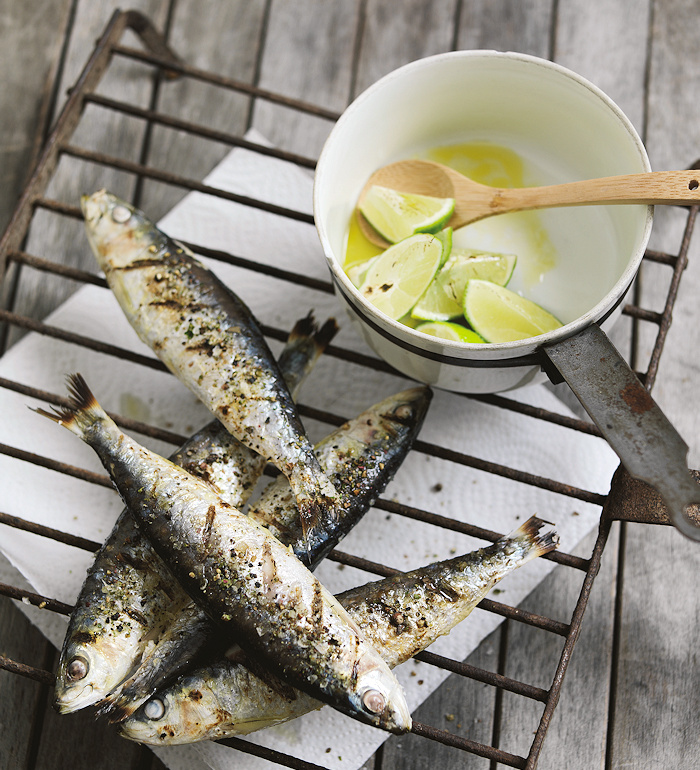 Remove sardines from fridge, brush off most of the salt and place on a fish grill tray