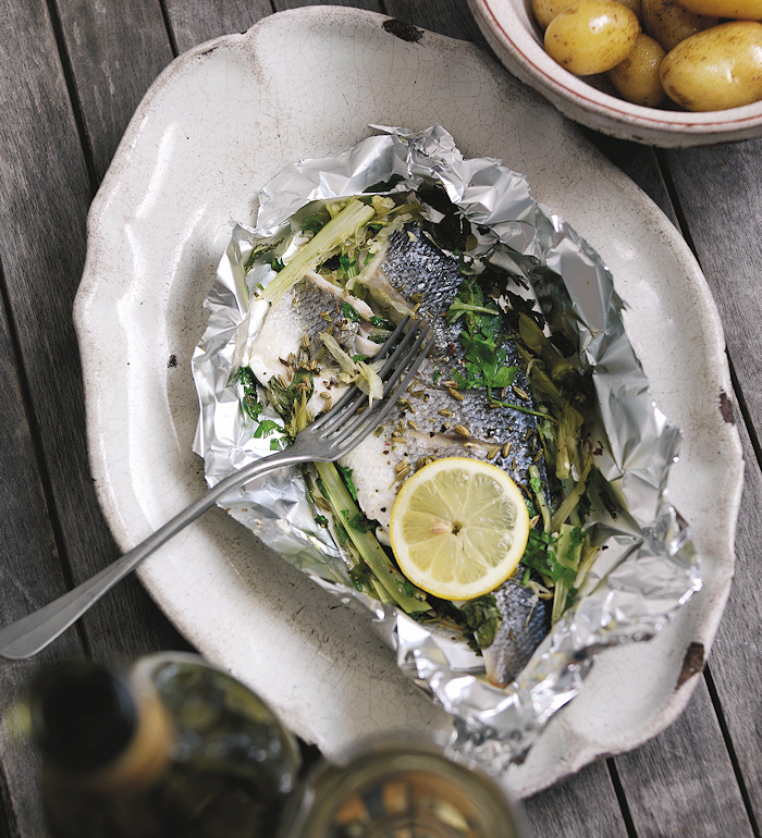 Mix fennel, garlic, basil, parsley and place equal amounts on each foil